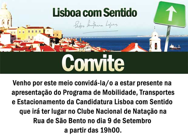 Amanhã Pedro Santana Lopes apresentará o seu programa de Mobilidade, Transportes e Estacionamento para Lisboa. Conheço algumas linhas gerais pelo que o candidato tem dito em ocasiões anteriores e pelo que já saiu nos media - por exemplo, a questão do desnivelamento do eixo Fontes Pereira de Melo / Avenida da República entre Picoas e Saldanha - mas nada mais. É por isso com expectativa que encaro esta apresentação naquele que é um tema central para qualquer cidade, mais a mais para o coração da maior área metropolitana portuguesa.